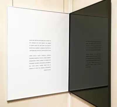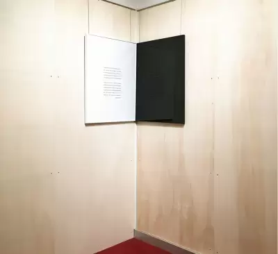 The works on display are Aurélie Nemours, Symmetrie, 1982 and Carey Young, Obsidian Contract, 2010.