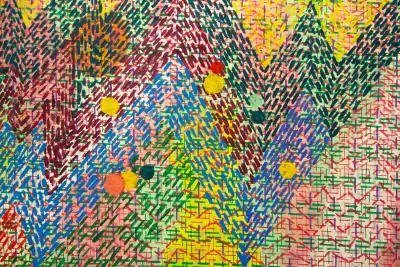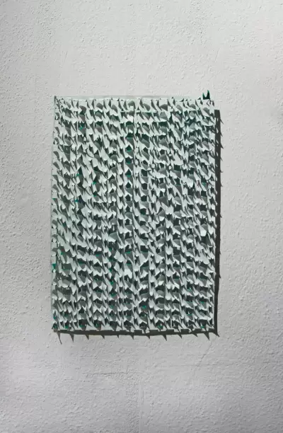 For this Inside Artphilein, the Foundation called upon the Togolese artist Ako Atikossie. Atikossie’s painting practice has always dialogued with three-dimensionality and his experimentation with matter. It is characterised by the use of the minus sign, which intertwines and overlaps in infinite parallel or converging lines, in a weaving that forces the material to make continuous changes.